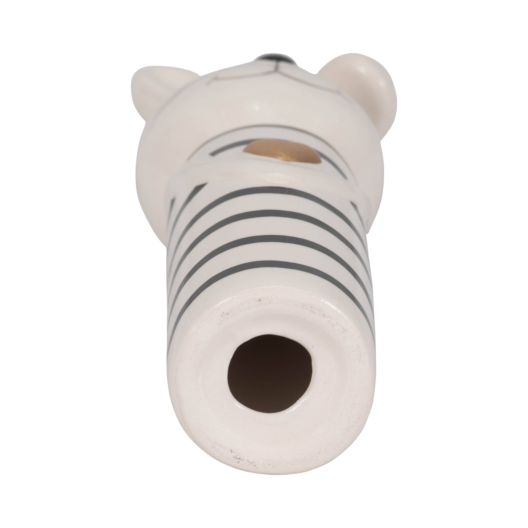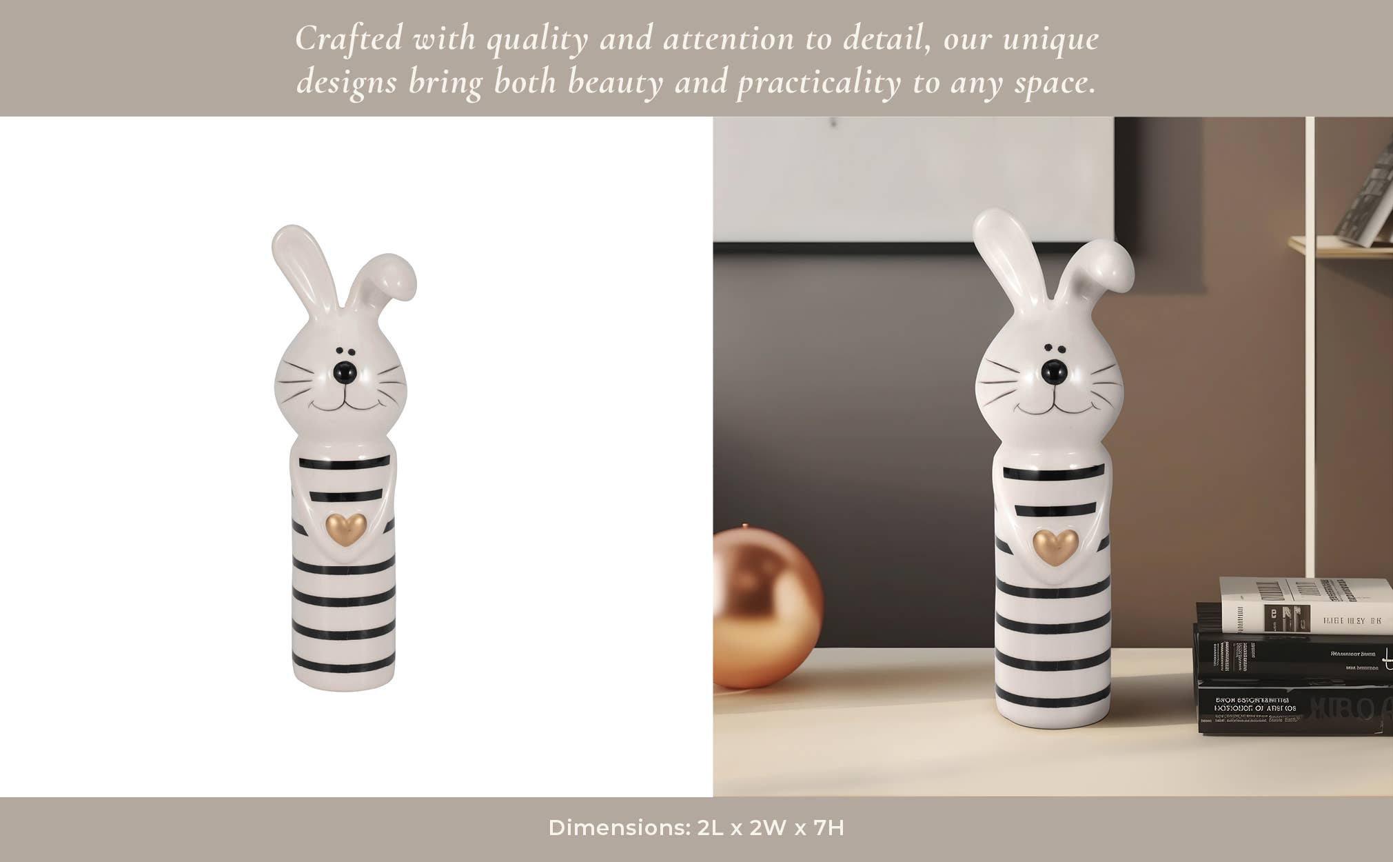 This 7-inch ceramic bunny figurine features distinctive black-and-white striped detailing with a gold heart accent. Constructed from quality ceramic with a glossy finish, it offers durability and visual appeal for shelves, mantels, or tabletops. Its compact size makes it versatile for various display settings while maintaining a strong decorative presence. Also available in larger size.