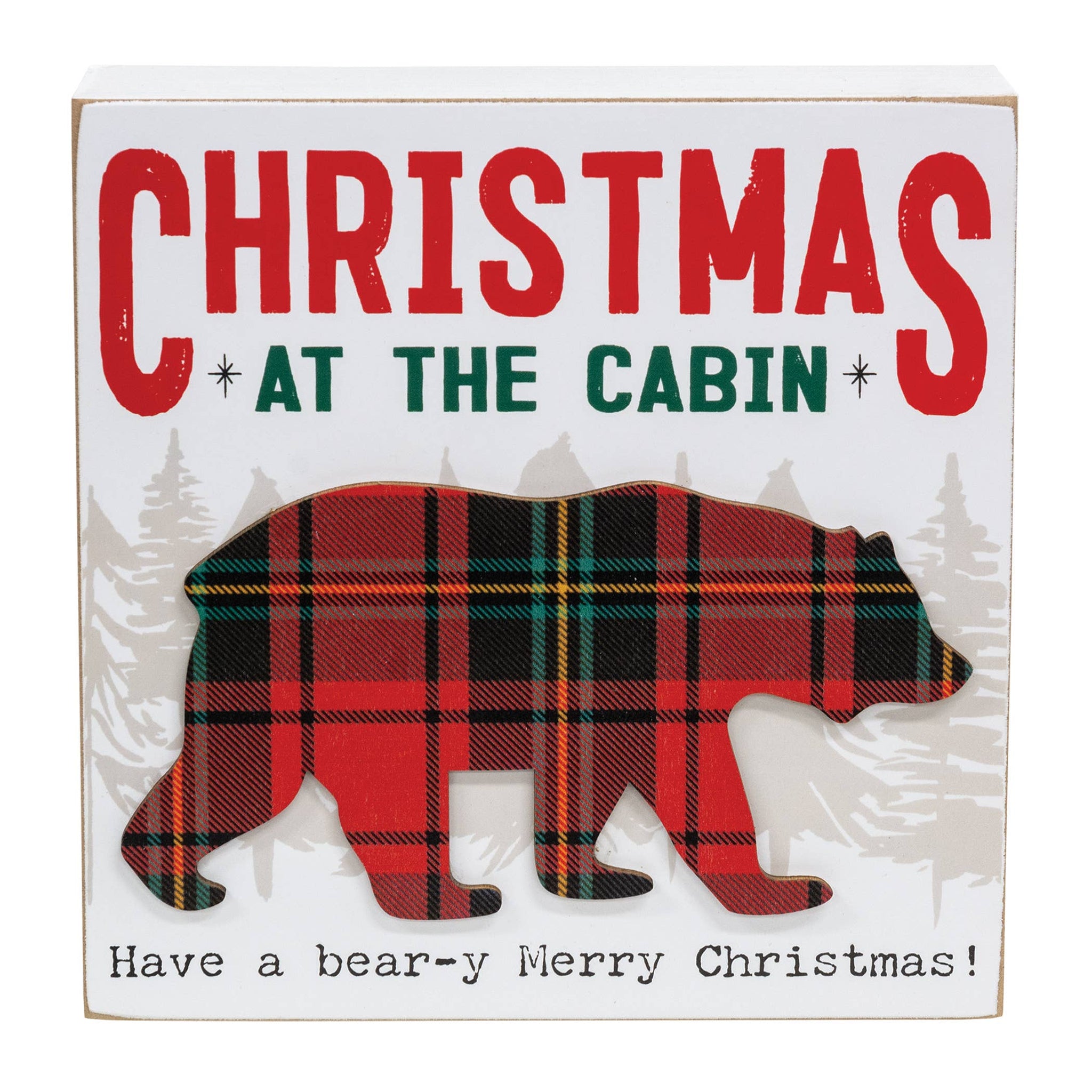 Bring cozy cabin vibes to your holiday collection with our Christmas At The Cabin Plaid Bear Box Sign. This 8" square by 1.5" deep sign features a dimensional layered bear in red plaid walking through the woods with the words "Christmas at the Cabin" in festive red and green lettering, and the playful phrase, “Have a bear-y Merry Christmas” in black across the bottom. This sign easily displays on shelves, mantels, or walls and adds a rustic charm your customers will adore.
