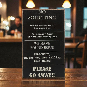 Say no to solicitors with this cheeky black plaque featuring white text and a wire hanger for instant installation. Keep your doorstep solicitation-free with a dash of personality.