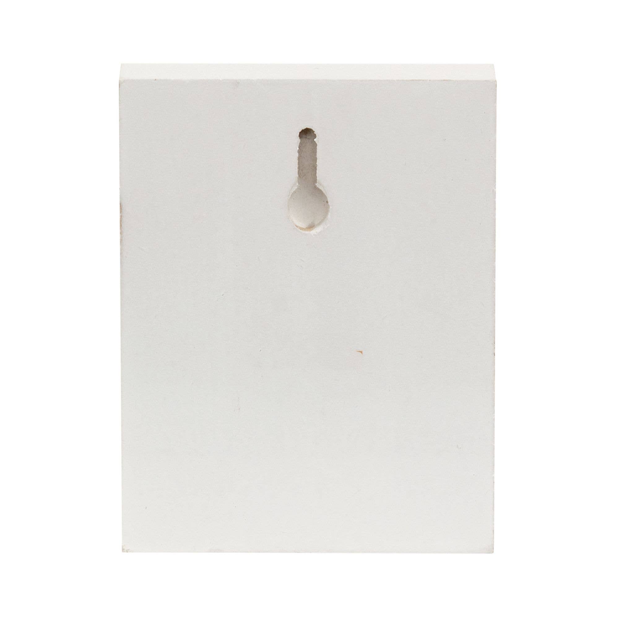 Our Jingle All the Way Plaid Reindeer Block features a raised, wooden reindeer icon covered in a red buffalo check pattern and reads, "jingle all the way." There is a smooth white surface, distressed edges, and a keyhole on the back for optional hanging display. This wooden block measures 4" tall by 3.5" across and 0.75" thick.