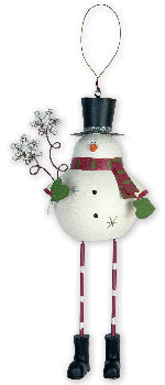 This metal Jolly Snowman Ornament creates lasting holiday memories with its charming design. Featuring red and white dangling legs and black boots, it stands out with a round belly, a black top hat, and a festive red and green scarf paired with green mittens. Holding a sprig of snowflakes in his right hand, this unique snowman brings a touch of whimsy to any decor.