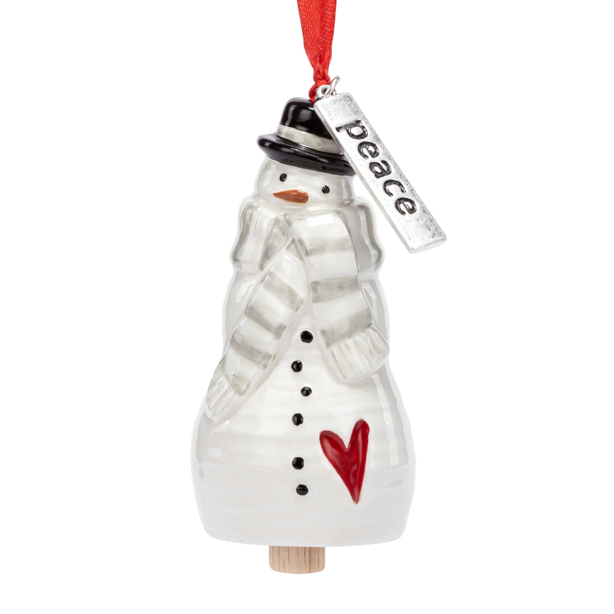 Our Peace Snowman Mini Bell Ornament brings festive cheer to any décor. Expertly made of ceramic, it showcases a gray and white striped scarf paired with a black top hat, red heart and accented by a silver-tone peace inscribed charm. Packaged in a gift box, our ornament is the perfect addition for your tree or a beautiful gift for anyone on your list.